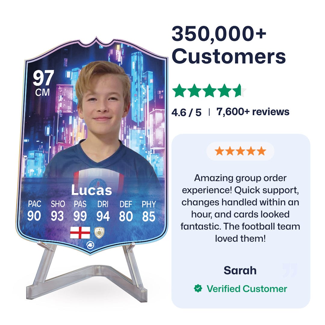 Once you’ve personalised your card, our design experts will edit your photo, design your card, and bring it to life in stunning quality. You’ll get a full preview before we print your card and every card’s quality is backed by our Gold Standard Guarantee. So far, over 350,000+ football fans agree: A CardsPlug football card is the ultimate football gift!