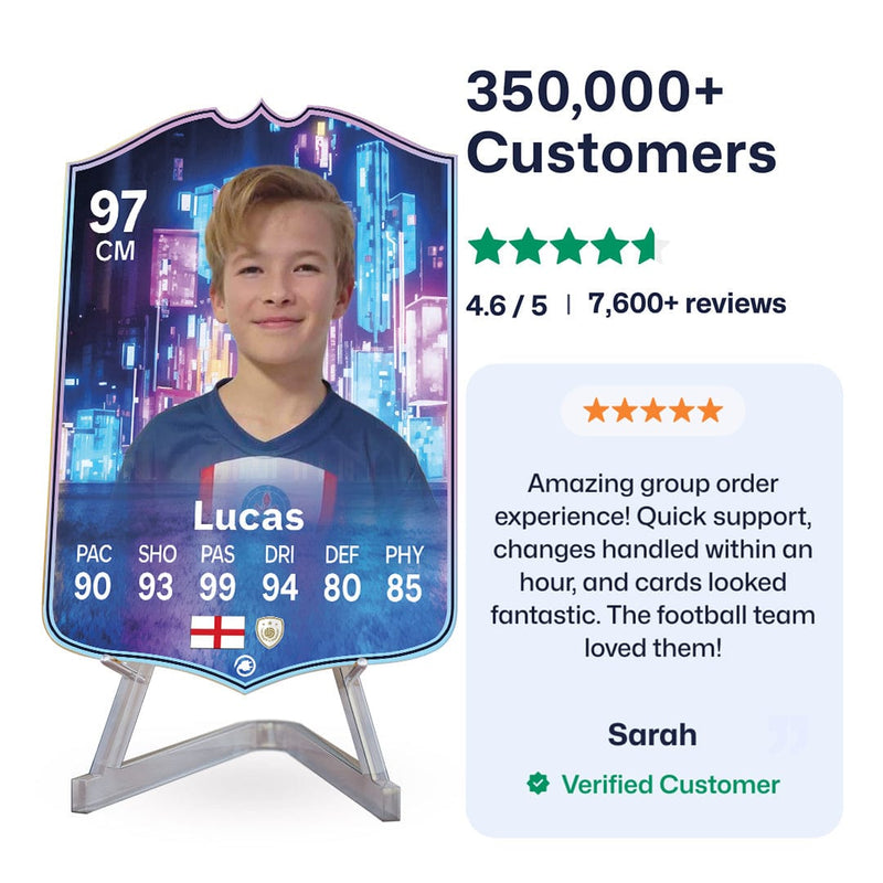 Yes! Our football card designers will remove the background from the photo you upload so it looks just like the football cards you might’ve seen games like EA FC 25, EA FC 24 or FIFA. We’ll also position the photo perfectly on the football card so it looks great. If there are any problems with the quality of your photo, we’ll reach out and let you know. Plus, our website's AI will remove the background on the image for visual purposes before purchase so you can see it without a background on the card.