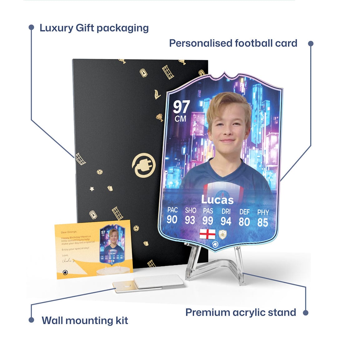 When it comes to personalising your card, the basic steps are to upload a photo and add a name to your card. Then you’ll add details like your player’s position and skill ratings out of 99 for each football skill shown on the card. Our online card builder makes this really easy. And if you aren’t a football card expert, don’t worry!