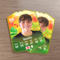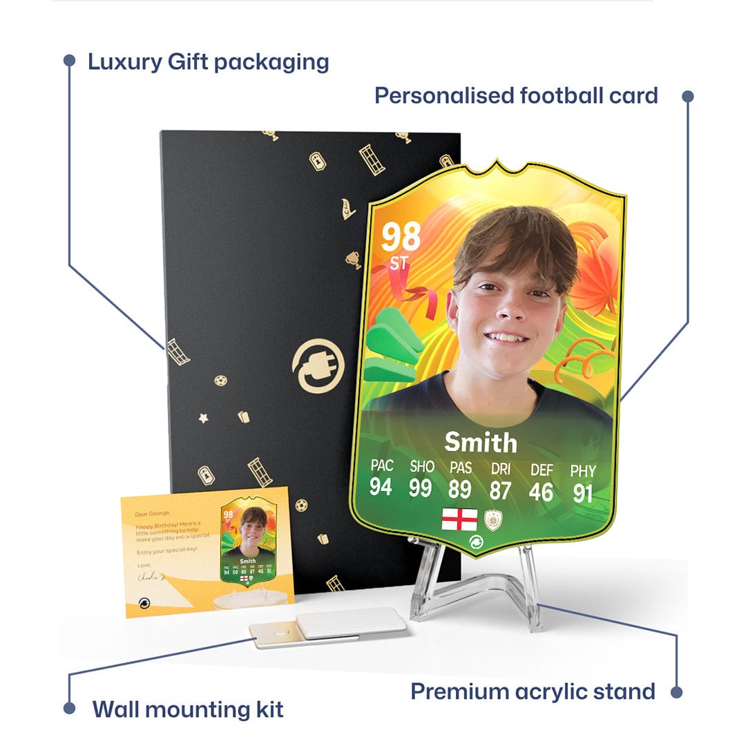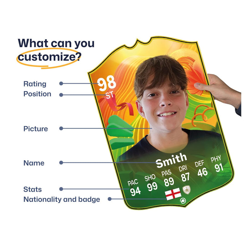 When it comes to personalising your card, the basic steps are to upload a photo and add a name to your card. Then you’ll add details like your player’s position and skill ratings out of 99 for each football skill shown on the card. Our online card builder makes this really easy. And if you aren’t a football card expert, don’t worry!