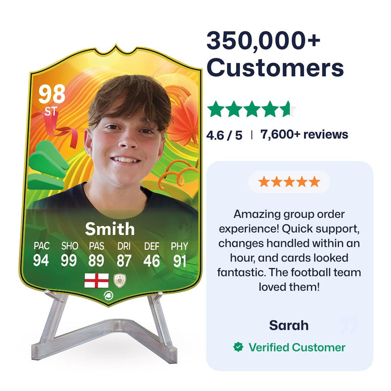Yes! Our football card designers will remove the background from the photo you upload so it looks just like the football cards you might’ve seen games like EA FC 25, EA FC 24 or FIFA. We’ll also position the photo perfectly on the football card so it looks great. If there are any problems with the quality of your photo, we’ll reach out and let you know. Plus, our website's AI will remove the background on the image for visual purposes before purchase so you can see it without a background on the card.